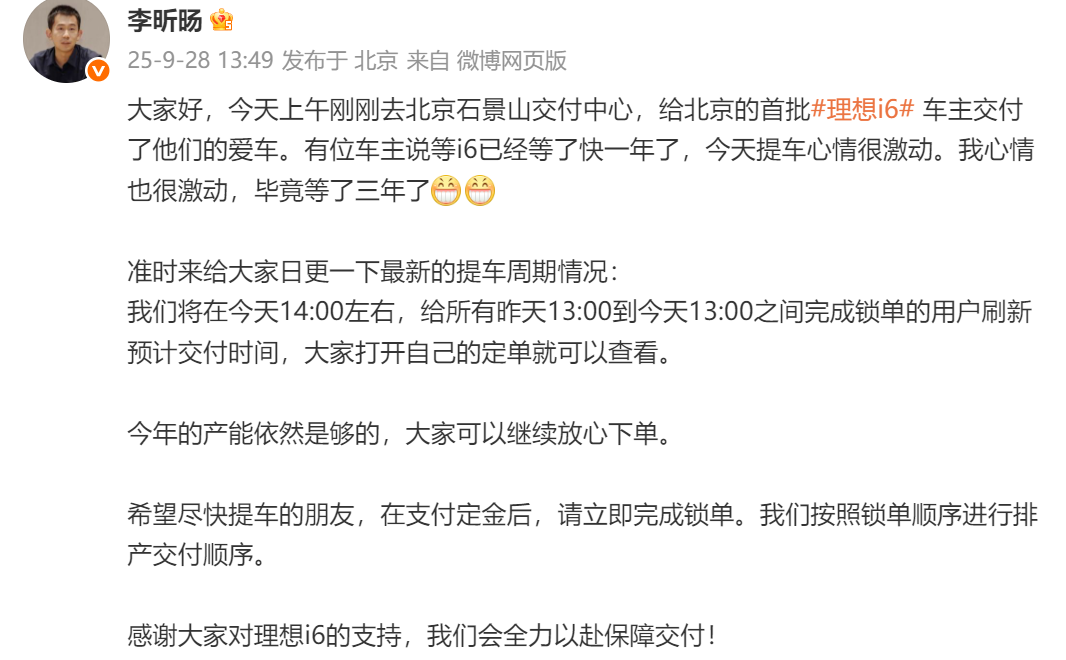 今日,理想汽车i6负责人李昕旸发文介绍i6的最新提车周期情况,“我们将在今天14:00左右,给所有昨天13:00到今天13:00之间完成锁单的用户刷新预计交付时间”。