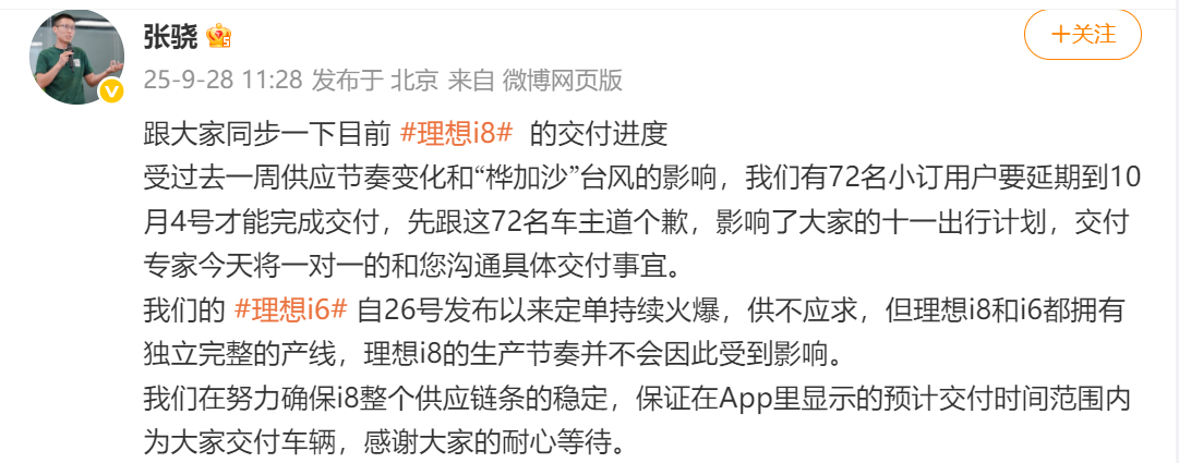 早些时候,理想汽车i8负责人张骁也发文表示,理想i6自26日发布以来定单持续火爆,供不应求,但理想i8和i6都拥有独立完整的产线,理想i8的生产节奏并不会因此受到影响。
